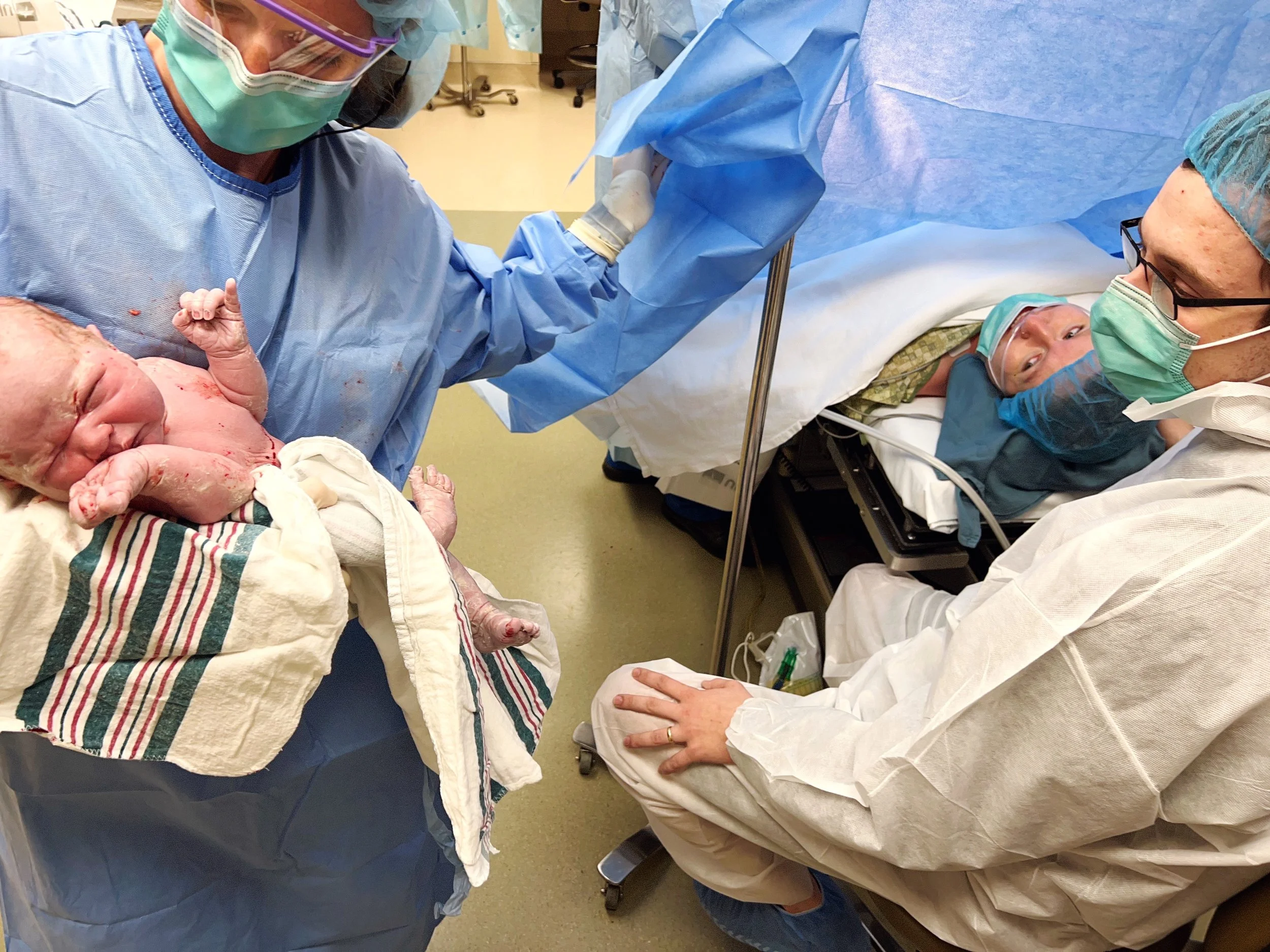 I'm so thankful that I got to have both Zach and Carly with me in the OR for support. As soon as I had the epidural placed and was no longer focused on the pain and pushing, I was able to relax and feel the excitement of knowing we would meet our baby in a few short minutes. I had a bleed during surgery which was another tense moment, but the surgical team, Zach, and Carly all remained calm and distracted me, maintaining the most peaceful environment I'd ever experienced in an OR (and that's saying something considering it was the first time I was there as a patient!).